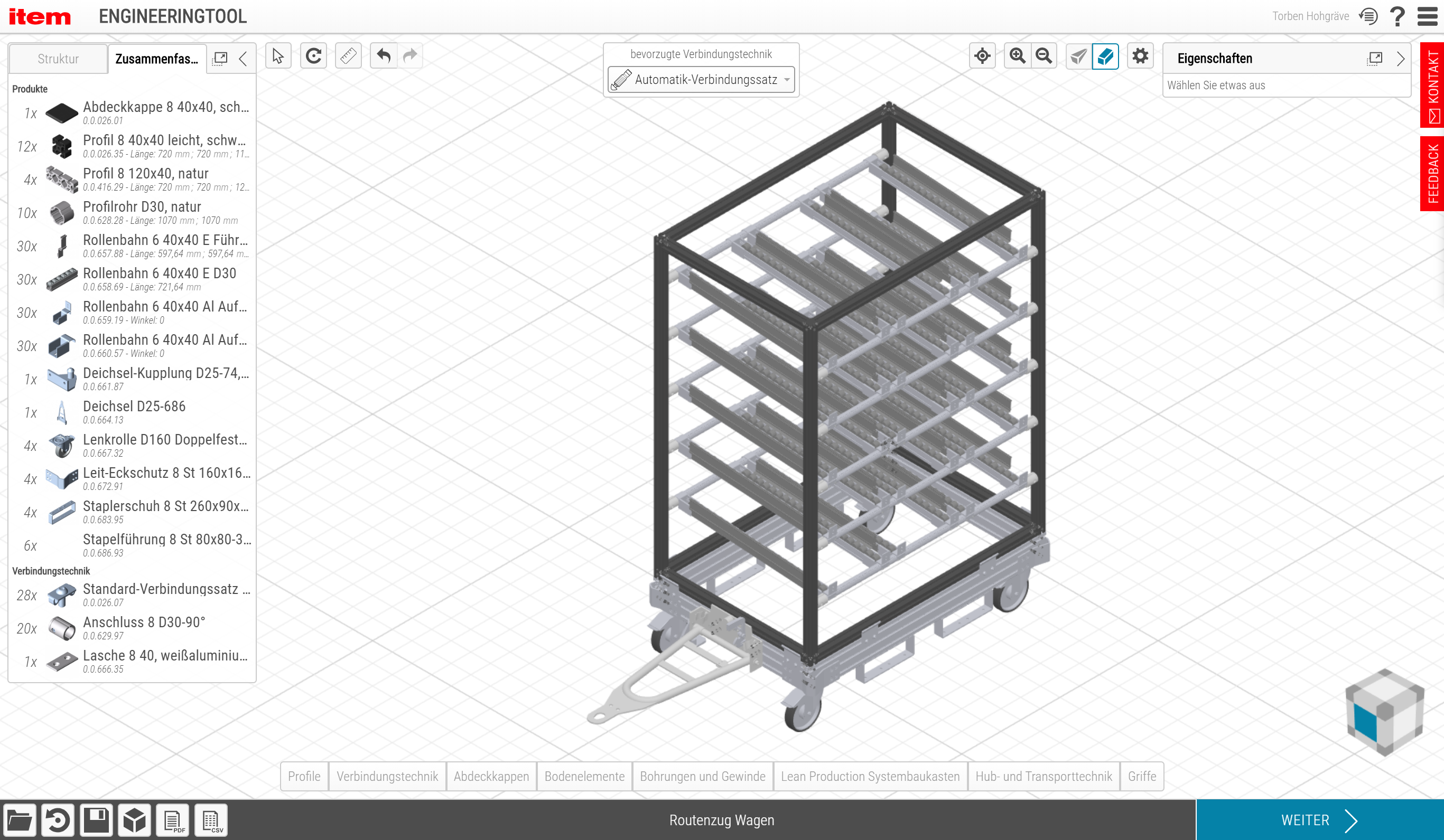 The rules-based functions of the item Engineeringtool simplify the 3D engineering of factory equipment, assemblies and frames. A large number of components from the item MB Building Kit System and the item Lean Production Building Kit System are available for selection. The latest update has added numerous new functions to the intelligent online tool. For example, users can choose from various views of their design and switch to a different perspective whenever they want. A 3D cube at the edge of the screen makes light work of setting the precise viewing angle required. The catalogue’s user-friendly new list view is also very clearly structured. The effects of the product filters are immediately apparent and technical data is easier to compare, which means users can find the right product far faster. Furthermore, the option of specifying whether the raised edge of flanged wheels should be on the right or left means frames with roller conveyors can now be adapted during the engineering process.