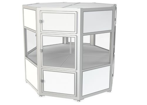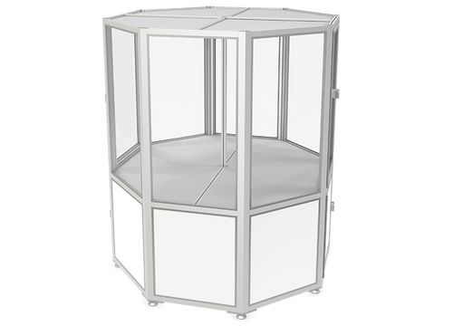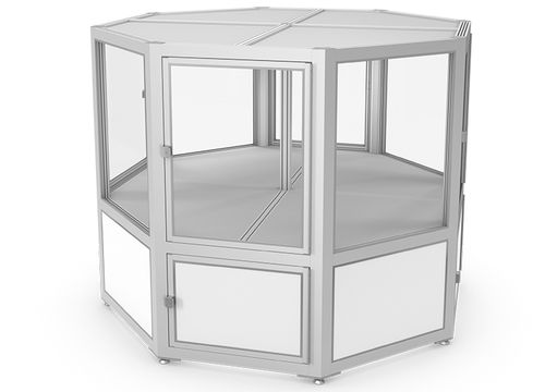 Art. Nr. EX-01150The space-saving machine enclosure for robot arms, small rotary indexing tables or other rotatory applications. Process and supply sections are separate and can be accessed via four separate doors. Cable conduits in the corner profiles provide a secure and clear housing for lines and cables.