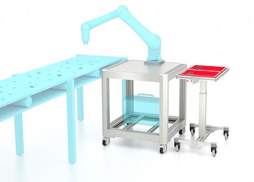 EX-01585With the mobile workstation, cobots can be used very easily for changing tasks at different locations. Four Jacking Castors make it easy to move the compact frame and to fix and level the robot island at any location. Adjustable Feet with Base Plates can also be used for stationary use.
